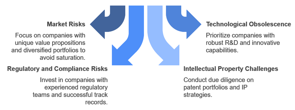 Figure 6. Investing in emerging biosensor technologies offers significant opportunities but also involves risks such as market competition, technological obsolescence, regulatory hurdles, and intellectual property challenges, which can be mitigated through careful evaluation and strategic investment in companies with strong IP, R&D, and regulatory expertise.