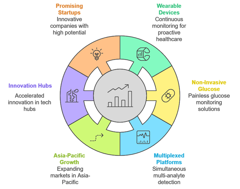 Figure 5. The biosensor market presents significant investment opportunities, driven by high-growth segments such as wearable and implantable devices, non-invasive glucose monitoring, and multiplexed biosensing platforms, with promising prospects in emerging markets and innovation hubs.